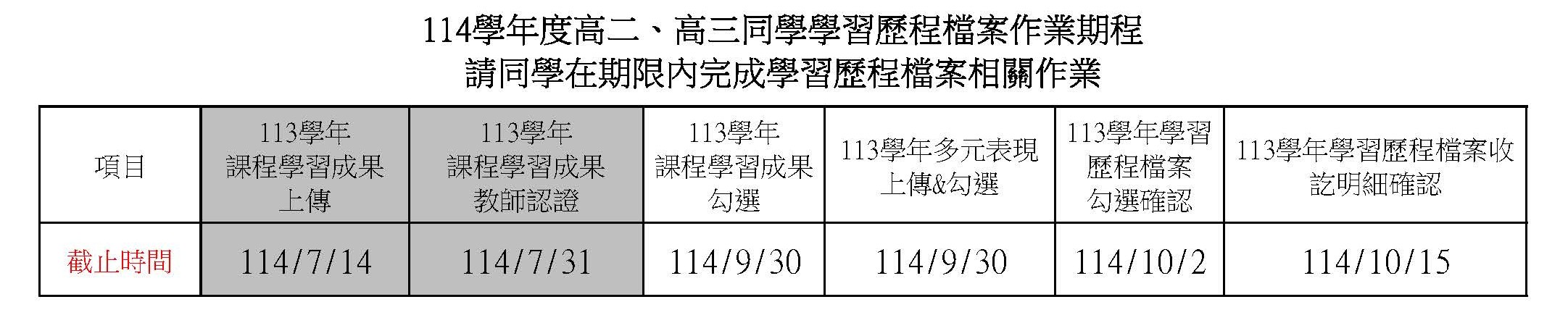 114學年度學習成果和多元表現上傳勾選作業時間: