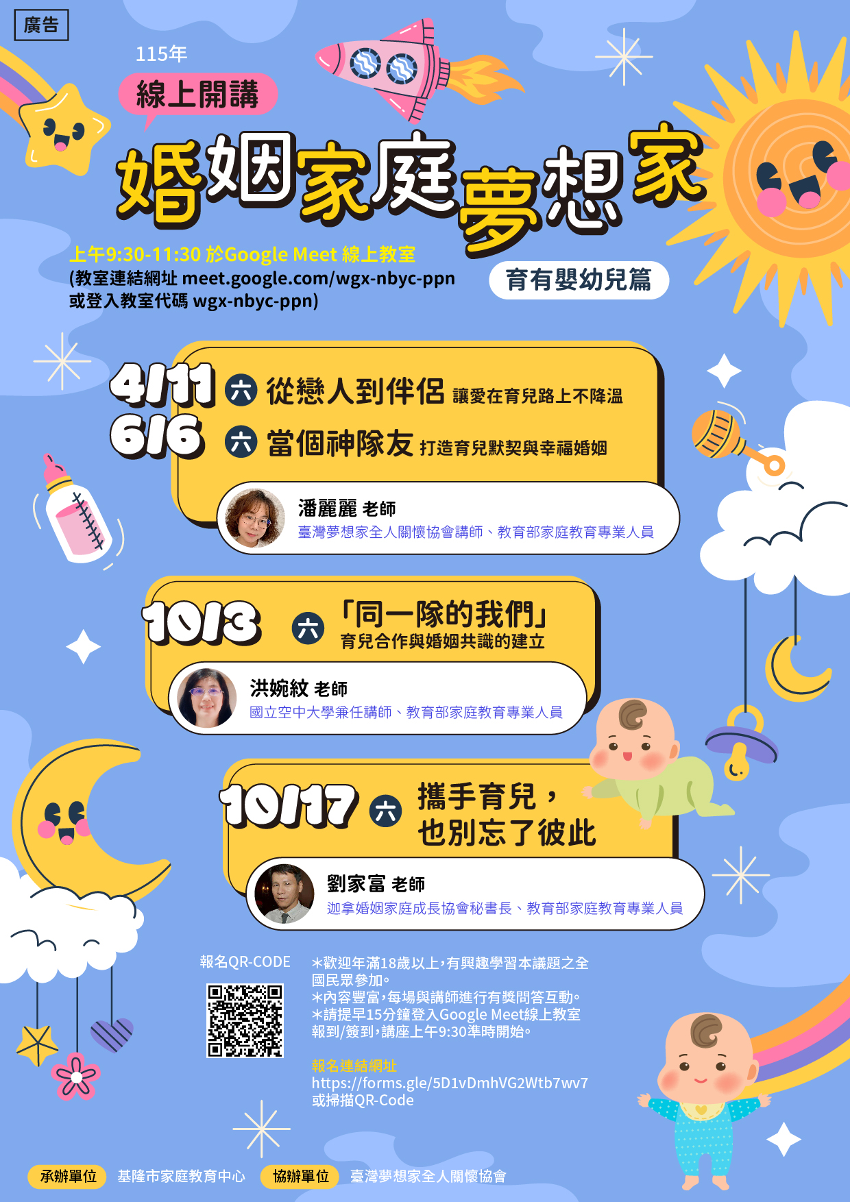 【轉知】基隆市家庭教育中心115年4月至10月辦理「婚姻家庭夢想家線上開講~育有嬰幼兒篇」4場
